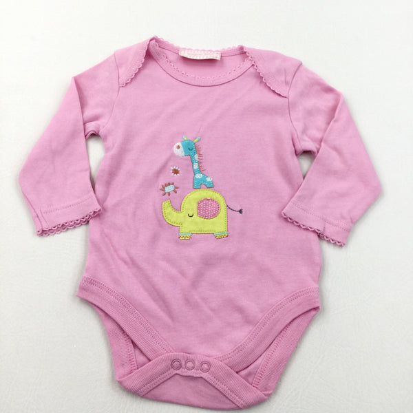 Animals Appliqued Pink Long Sleeve Bodysuit - Girls 6-9 Months